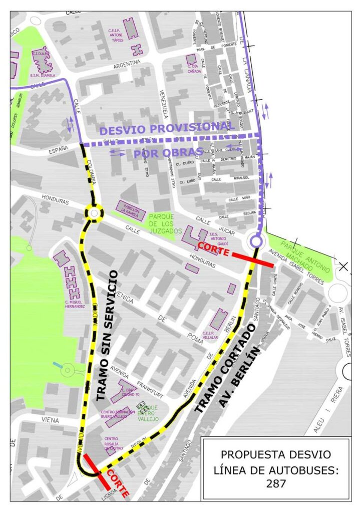 Línea 287. No circulará por la Av. de Berlín ni Av. de Madrid, desviándose desde la calle Colombia por la calle Jesús de san Antonio y Av. de la Cañada hasta la rotonda de entrada a Av. de Isabel Torres.