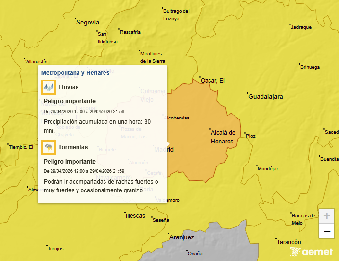 El aviso permanecerá activo desde las 12:00 hasta las 23:59 horas de mañana miércoles, 29 de abril, ante la previsión de una precipitación acumulada de hasta 30 milímetros en una hora, así como posibles rachas de viento fuertes o muy fuertes asociadas a las tormentas y posible granizo.