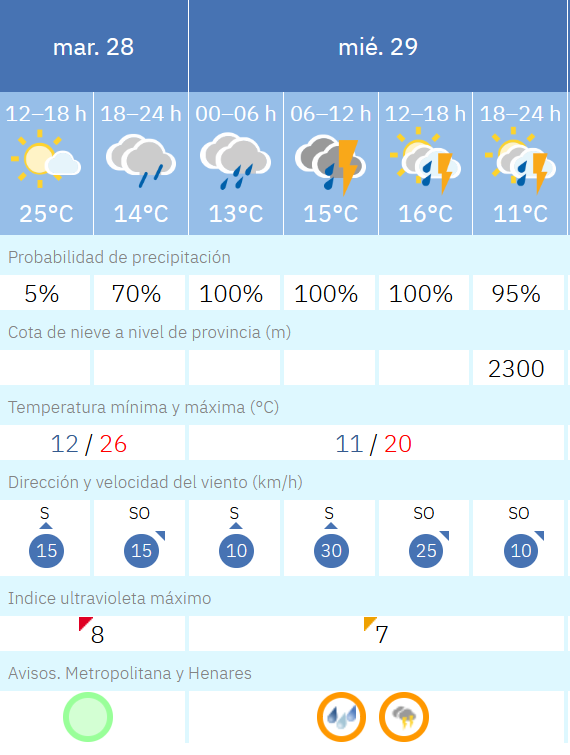 El Ayuntamiento de Coslada informa de la activación del nivel naranja por lluvias y tormentas decretado por la Agencia Estatal de Meteorología (AEMET) para el área metropolitana y del Henares, debido al riesgo de precipitaciones intensas y fenómenos tormentosos.