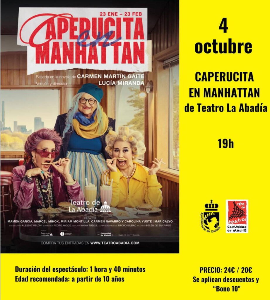 El Teatro Municipal de Coslada recibirá mañana sábado, 4 de octubre, a las 19:00 horas, la representación de Caperucita en Manhattan, una adaptación teatral de la célebre novela de Carmen Martín Gaite dirigida por Lucía Miranda. La obra combina el cuento clásico con música, sueños y reflexiones sobre la libertad, la identidad y el valor de ser uno mismo.