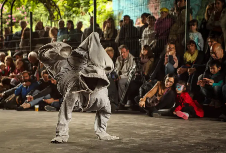 En escena, un simple montón de joggings se transforman en una criatura misteriosa y fascinante, acompañada por un guitarrista que, con sus acordes, da vida y ritmo al personaje.