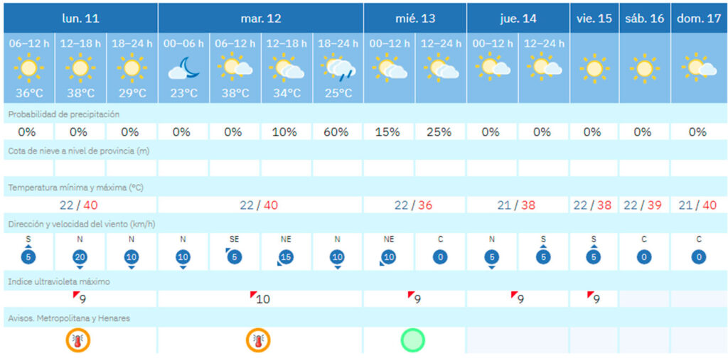 La Agencia Estatal de Meteorología (AEMET) informa del mantenimiento del nivel de aviso naranja del Protocolo de actuación ante olas de calor debido a las altas temperaturas previstas para los dos próximos días, según el protocolo de actuación de la Comunidad de Madrid ante fenómenos meteorológicos adversos.