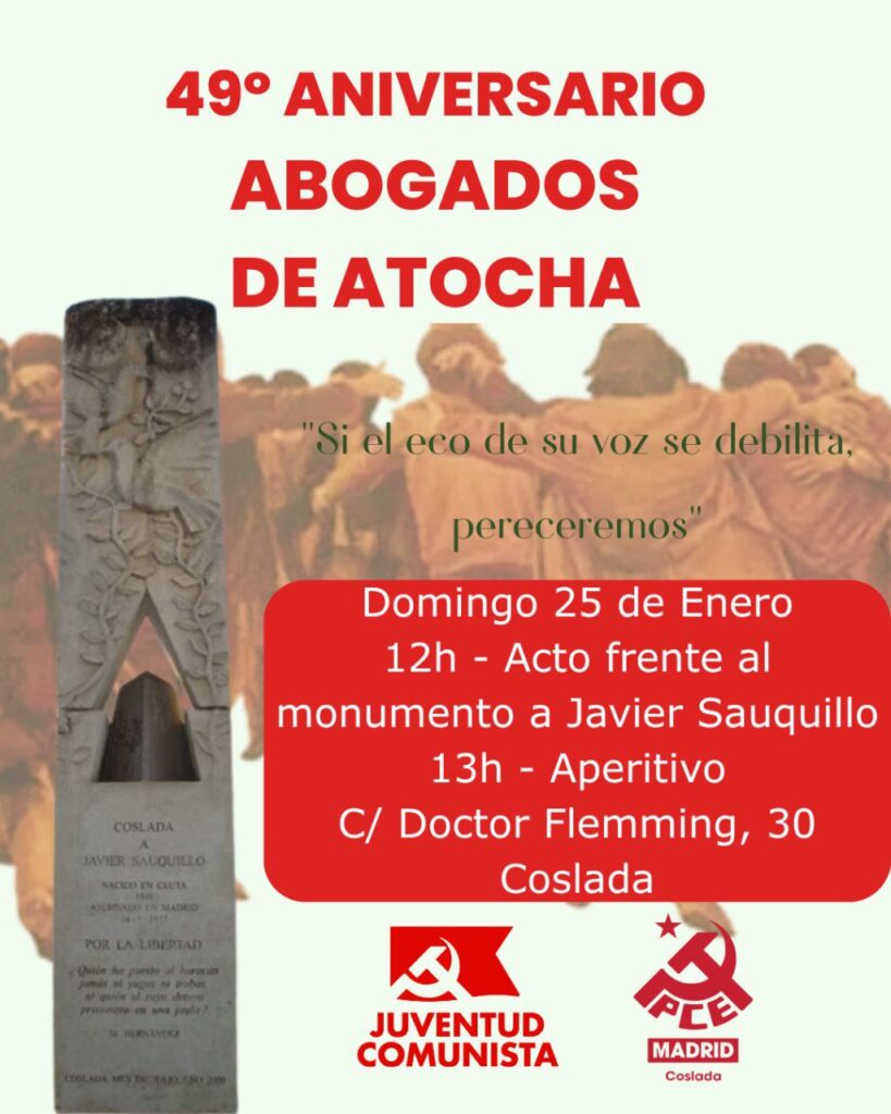 Coslada celebrará este domingo 25 de enero un acto de homenaje con motivo del 49º aniversario del atentado contra los abogados de Atocha, uno de los episodios más graves de la violencia política durante la Transición española. El homenaje tendrá lugar a las 12.00 horas frente al monumento dedicado a Javier Sauquillo, situado en la calle Doctor Fleming número 30.