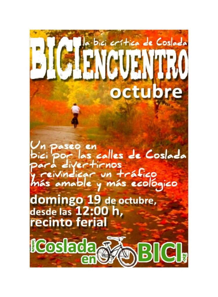 La asociación Coslada en Bici ha convocado para el próximo domingo 19 de octubre un paseo tranquilo y reivindicativo por el municipio con el objetivo de reclamar medidas que favorezcan una movilidad más sostenible y segura. La cita busca visibilizar la necesidad de reducir la velocidad de los vehículos en las calles y apostar por una planificación urbana que dé más espacio a peatones y ciclistas.