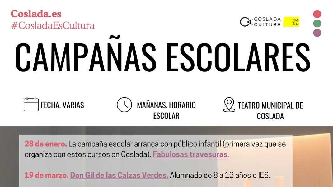 La campaña escolar arrancará el próximo 28 de enero con público infantil, por primera vez en Coslada para estos cursos, con la obra Fabulosas travesuras. El programa continuará con las siguientes citas: