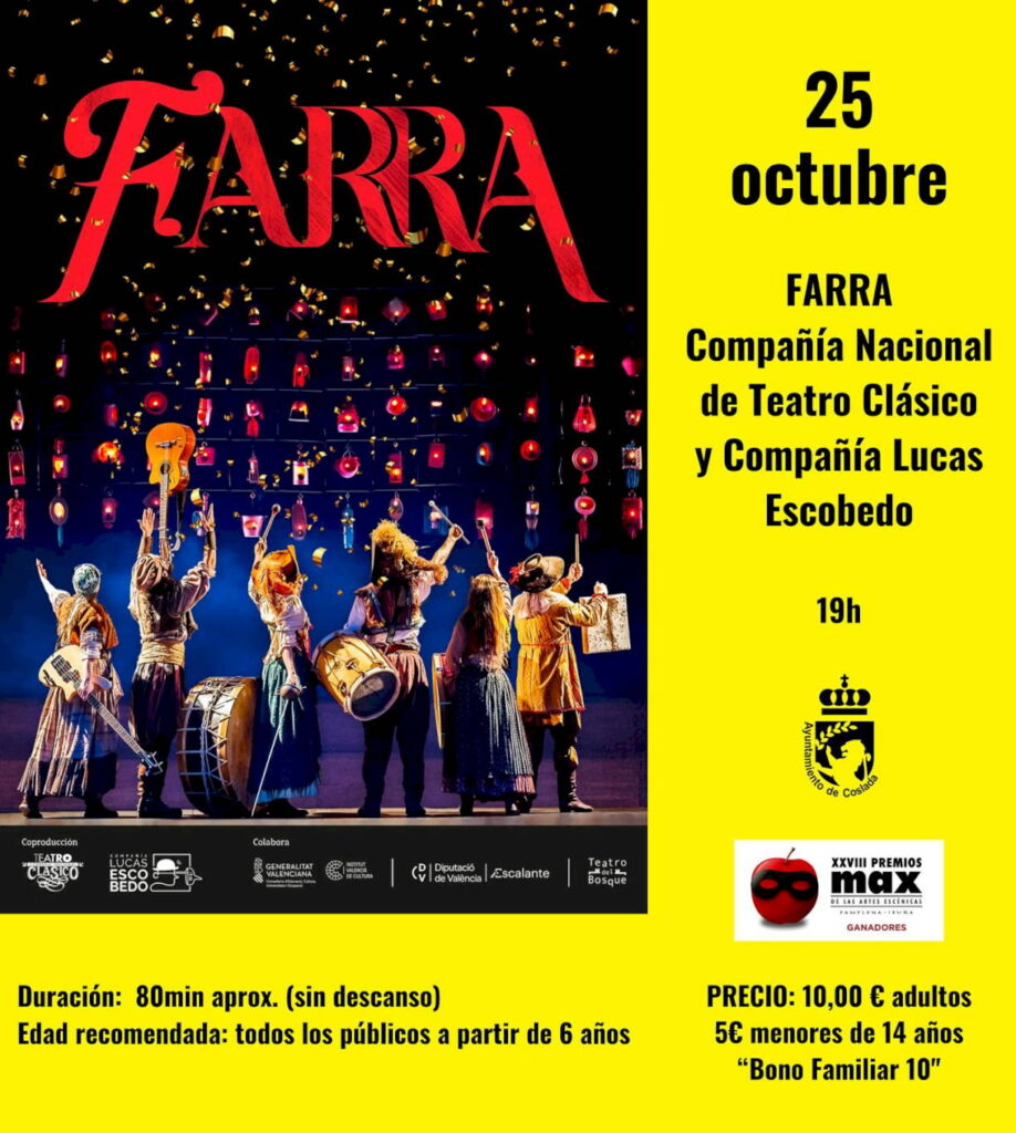 Farra tendrá lugar el sábado 25 de octubre, a las 19.00 horas, en el Teatro Municipal de Coslada. La representación refuerza el compromiso del Ayuntamiento de Coslada con la difusión de un ocio de calidad y con el acercamiento de las artes escénicas a toda la ciudadanía, en este caso, con una propuesta que combina el espíritu festivo del carnaval con la excelencia artística reconocida a nivel nacional.