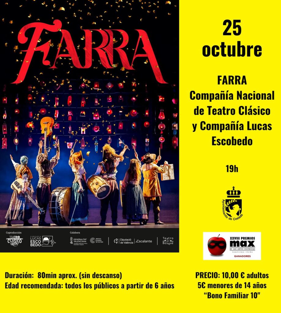 El Teatro Municipal de Coslada acoge este sábado, 25 de octubre, a las 19:00 horas, el espectáculo Farra, una producción de la Compañía Nacional de Teatro Clásico junto con la Compañía Lucas Escobedo, galardonada con el Premio Max 2025 al Mejor Espectáculo Musical.