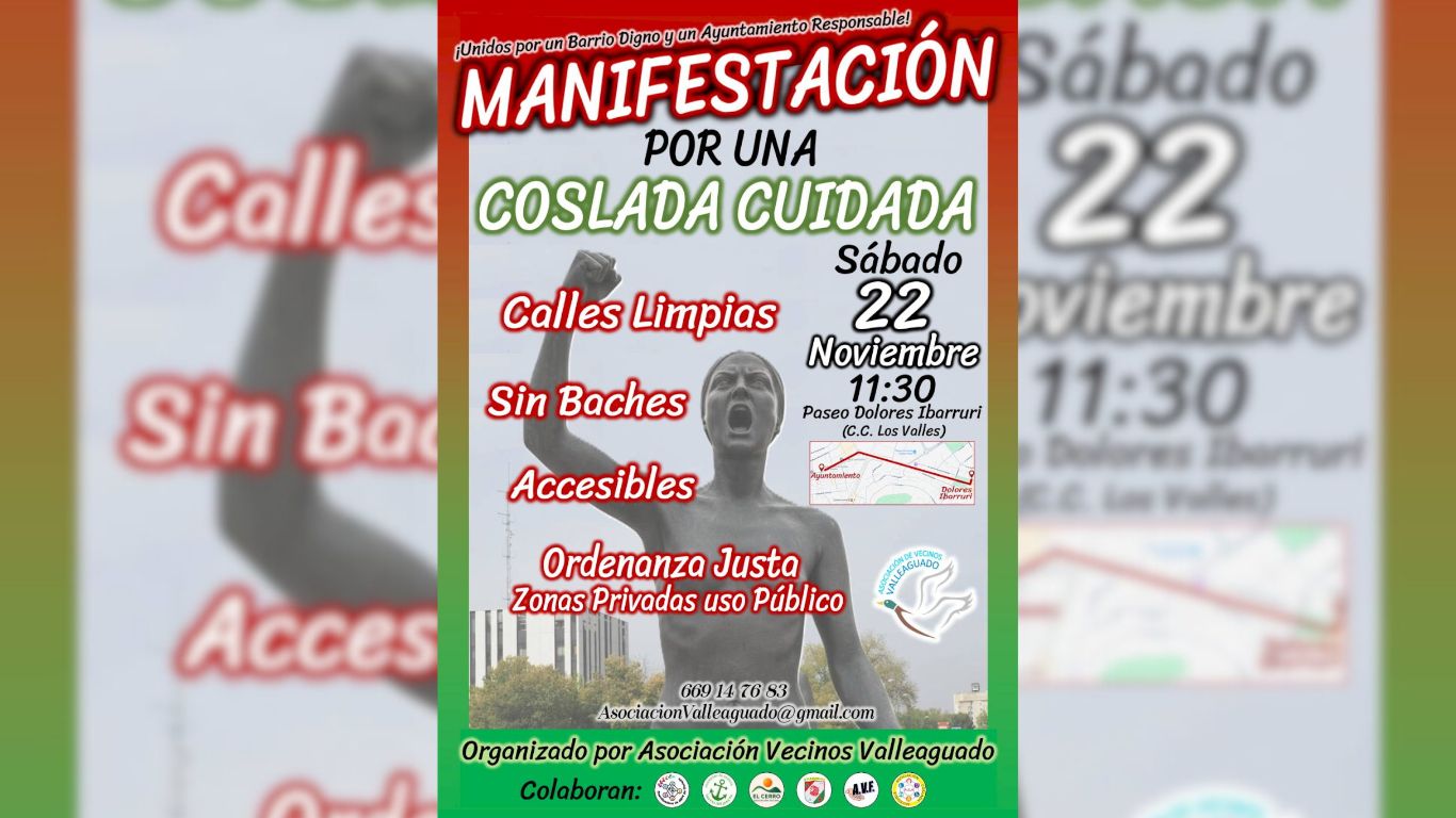 La manifestación partirá desde el Paseo Dolores Ibárruri y finalizará frente al Ayuntamiento de Coslada. Con esta movilización, los vecinos y vecinas quieren exigir «unas calles limpias, sin baches y accesibles para todos así como una ordenanza justa y razonable sobre las zonas privadas de uso público, problemática por la que muchas de estas incidencias se dan en Coslada».