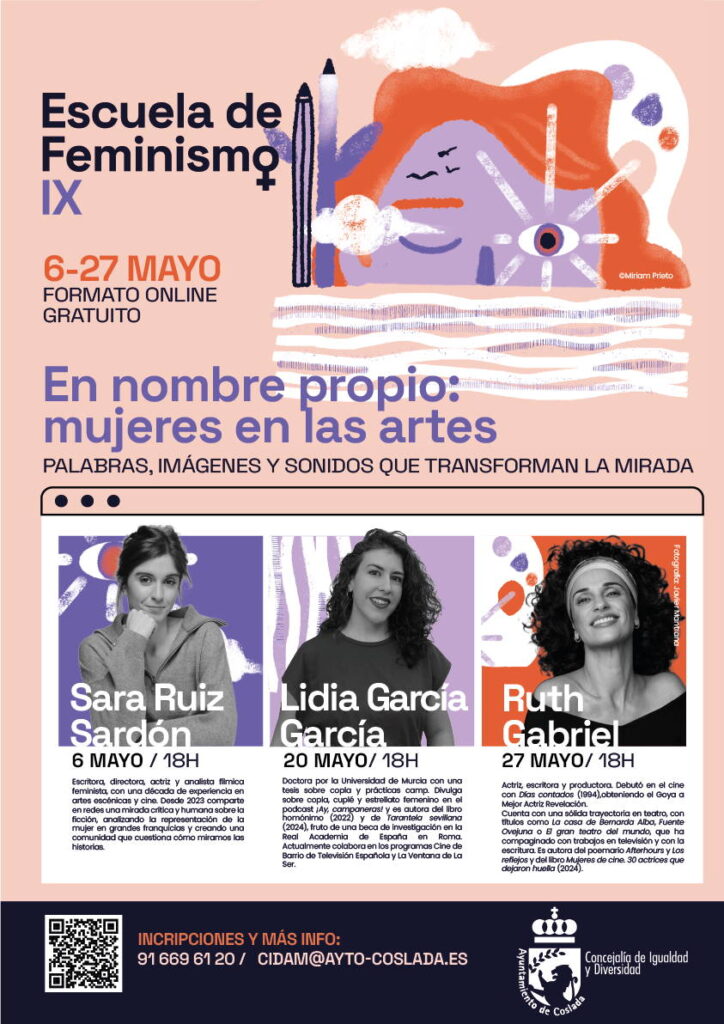 A lo largo de tres sesiones online, que se celebrarán los miércoles 6, 20 y 27 de mayo a las 18:00 horas, la Escuela de Feminismo cosladeña reunirá a tres ponentes de reconocido prestigio cuyas trayectorias destacan por su calidad y capacidad de generar pensamiento crítico en torno a la representación y el papel de las mujeres en la cultura. Las personas que participen en la formación recibirán un certificado acreditativo.
