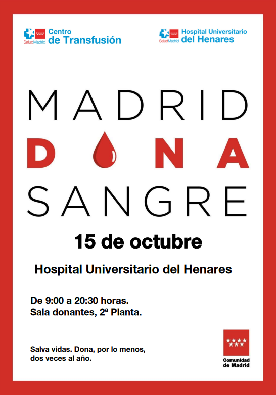 Los vecinos de Coslada, San Fernando de Henares, Velilla de San Antonio, Mejorada del Campo y Loeches están llamados a participar en la maratón de donación de sangre, el 15 de octubre de 2025 en horario de 9:00 a 20:30 horas, en la sala de donantes habitual de la 2ª planta, junto a quirófano.