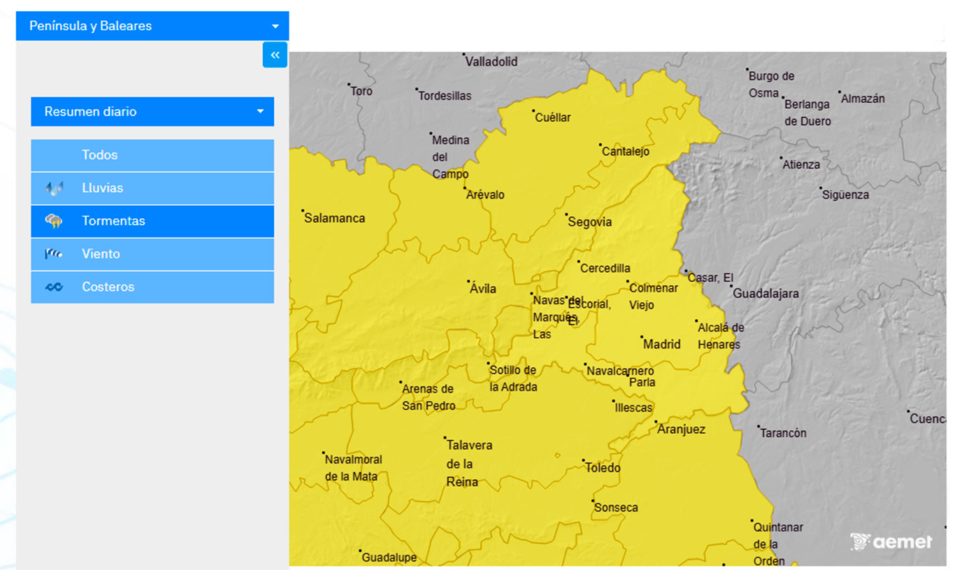 La Agencia Estatal de Meteorología ha lanzado la alerta amarilla, con nivel de aviso de peligro bajo, por tormentas con posibilidad de granizo de 20:00 a 00:00 horas en el Corredor del Henares y toda la región.