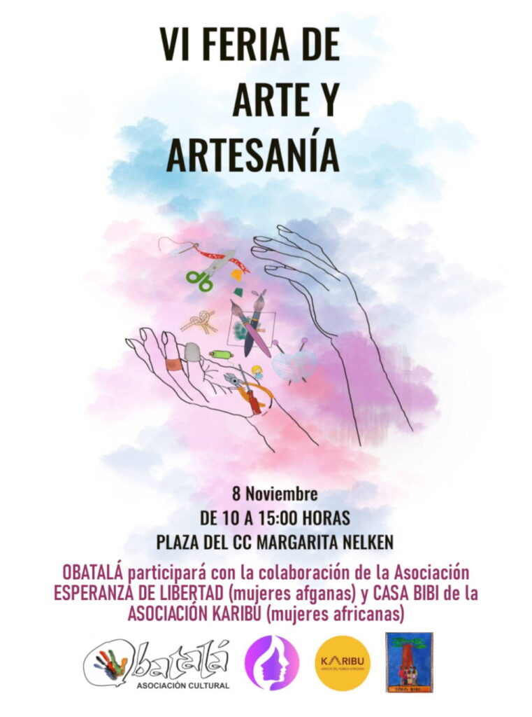 El próximo sábado 8 de noviembre tendrá lugar la VI Feria de Arte y Artesanía de Coslada y la Asociación Obatalá dispondrá de un espacio (en concreto el stand número 19) donde ofrecerá diferentes artículos de artesanía afgana, con la colaboración de la Asociación de Mujeres Afganas “Esperanza de Libertad” y de artesanía africana, ofrecida por Casa Bibi de la Asociación Karibu, integrada por personas mayores de origen africano.