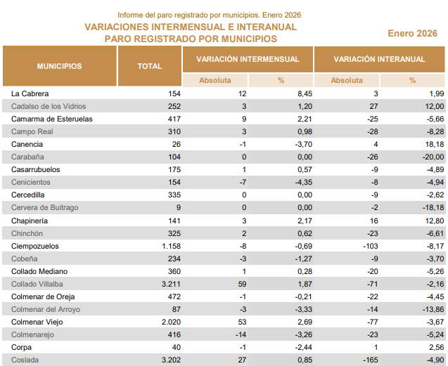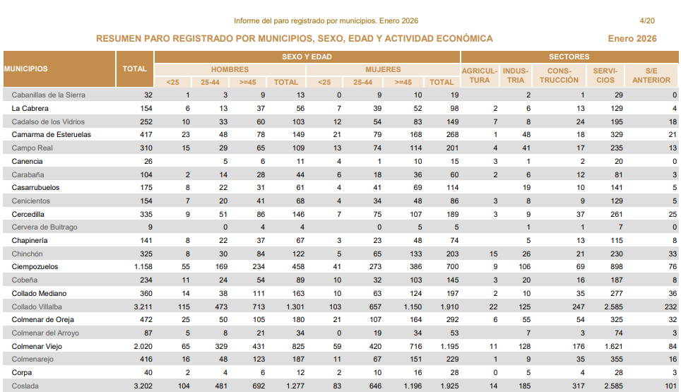 El paro registrado en Coslada se situó en 3.202 personas durante enero de 2026. Así lo reflejan los datos publicados por la Consejería de Economía, Hacienda y Empleo de la Comunidad de Madrid.
