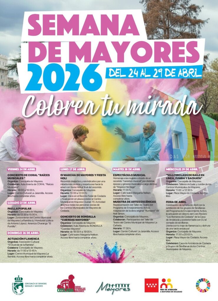 El Ayuntamiento de Coslada, a través de la Concejalía de Servicios Sociales y Mayores, celebrará la Semana de Mayores 2026 del 24 al 29 de abril con una agenda amplia de actividades culturales, deportivas y de convivencia que sitúan a las personas mayores en el centro de la vida de la ciudad.